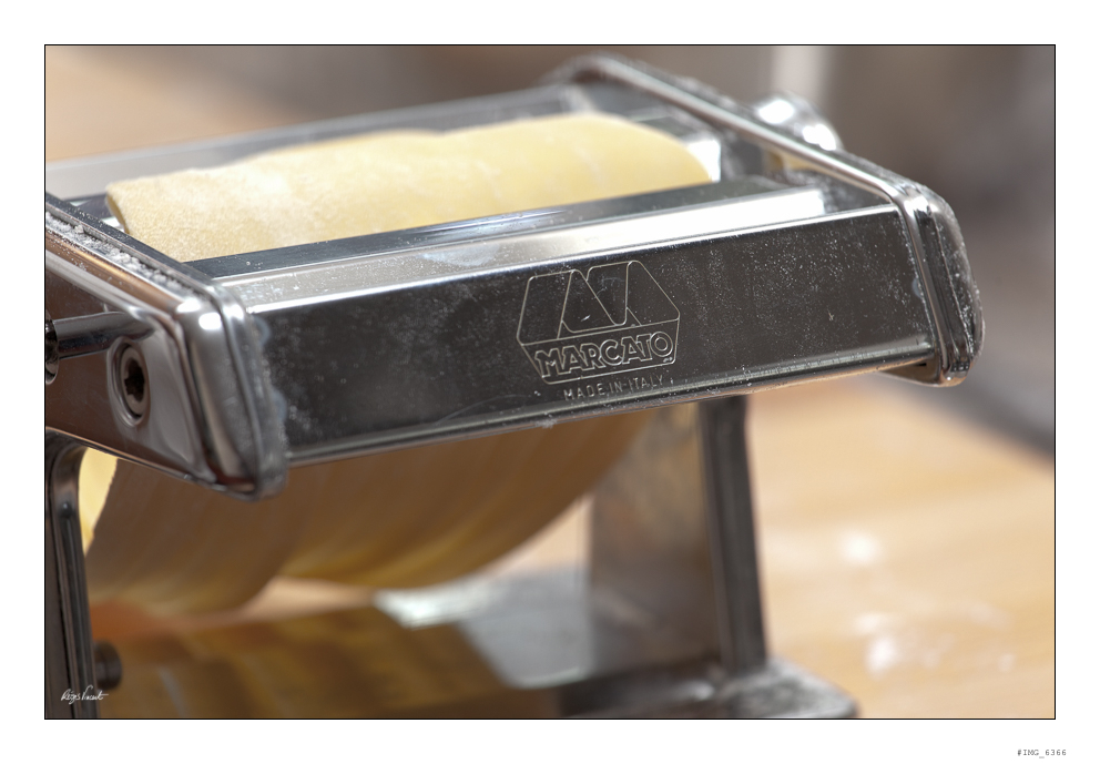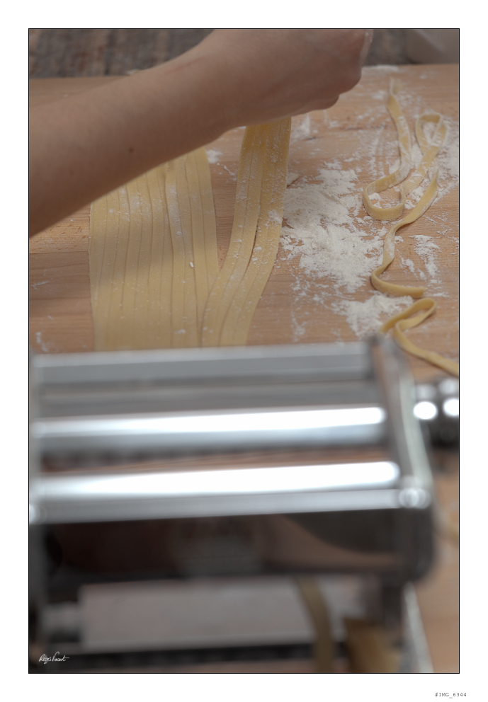Freshly made linguini are splitted by hand. The machine for making pasta is in the foreground (out of focus).